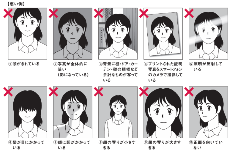 - カラー写真のみ可、ただし不鮮明な写真および髪などで目や輪郭が隠れている写真は不可。